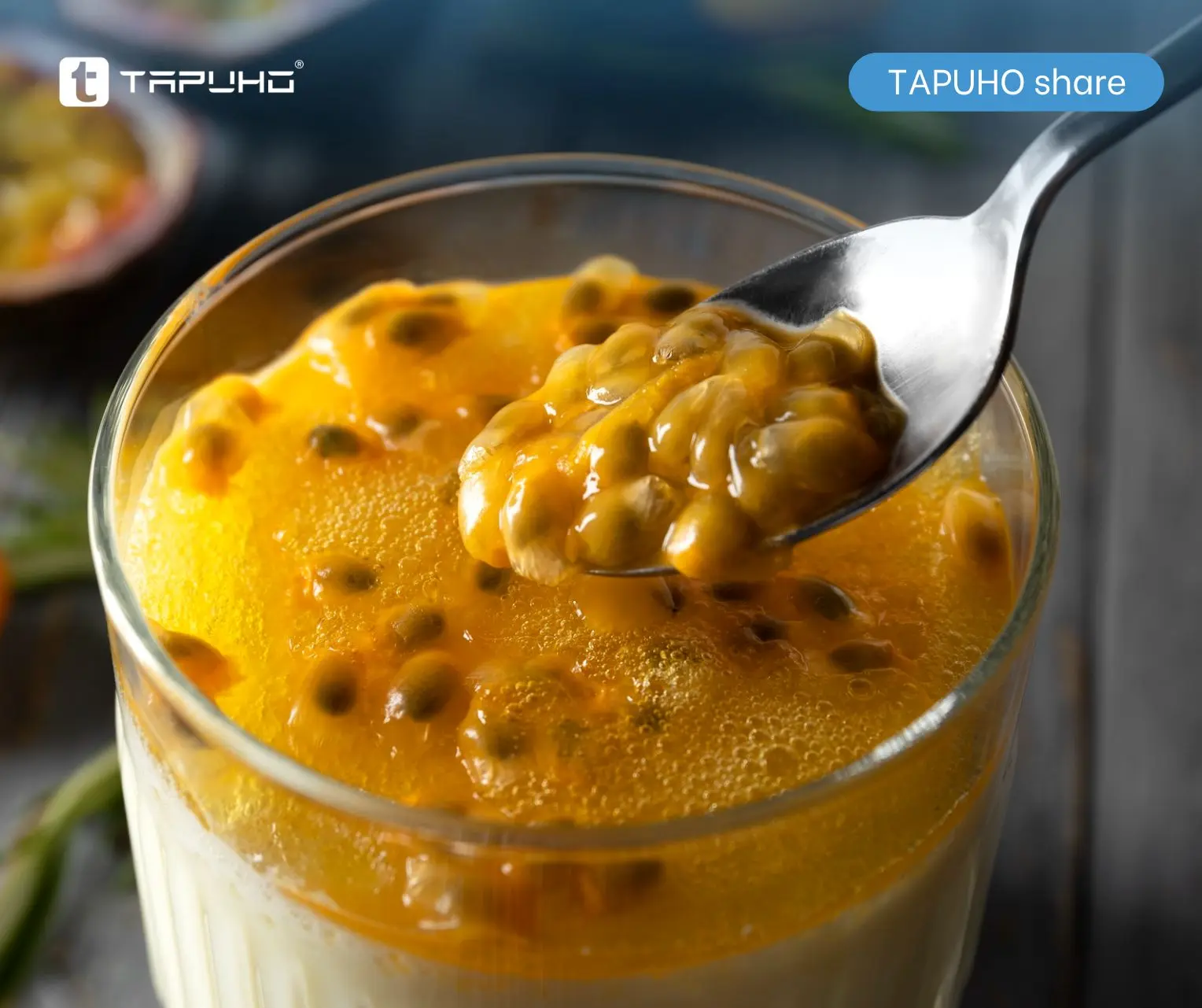 - Bước 3: Cắt đôi chanh leo, lấy phần ruột và lọc hạt (nếu muốn uống mịn).