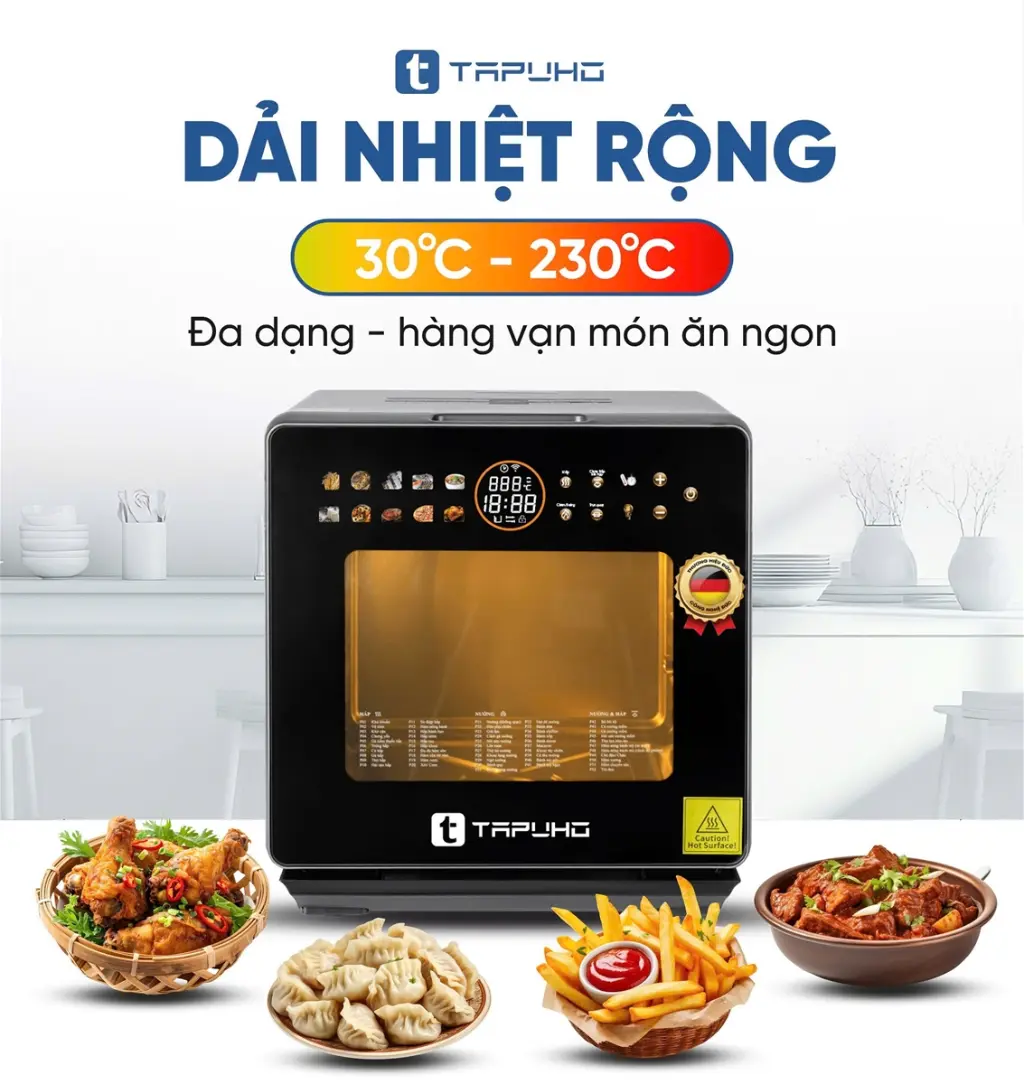 Với 4 chế độ nấu thức ăn chiên – hấp – hầm – nướng, nồi chiên hơi nước Tapuho đã mang đến cho khách hàng 60 công thức chế biến thức ăn. Công suất sản phẩm lên đến 1200w giúp bạn nhanh chóng làm chín thức ăn mà vẫn giữ được độ ngon ngọt và ẩm mượt từ bên trong.