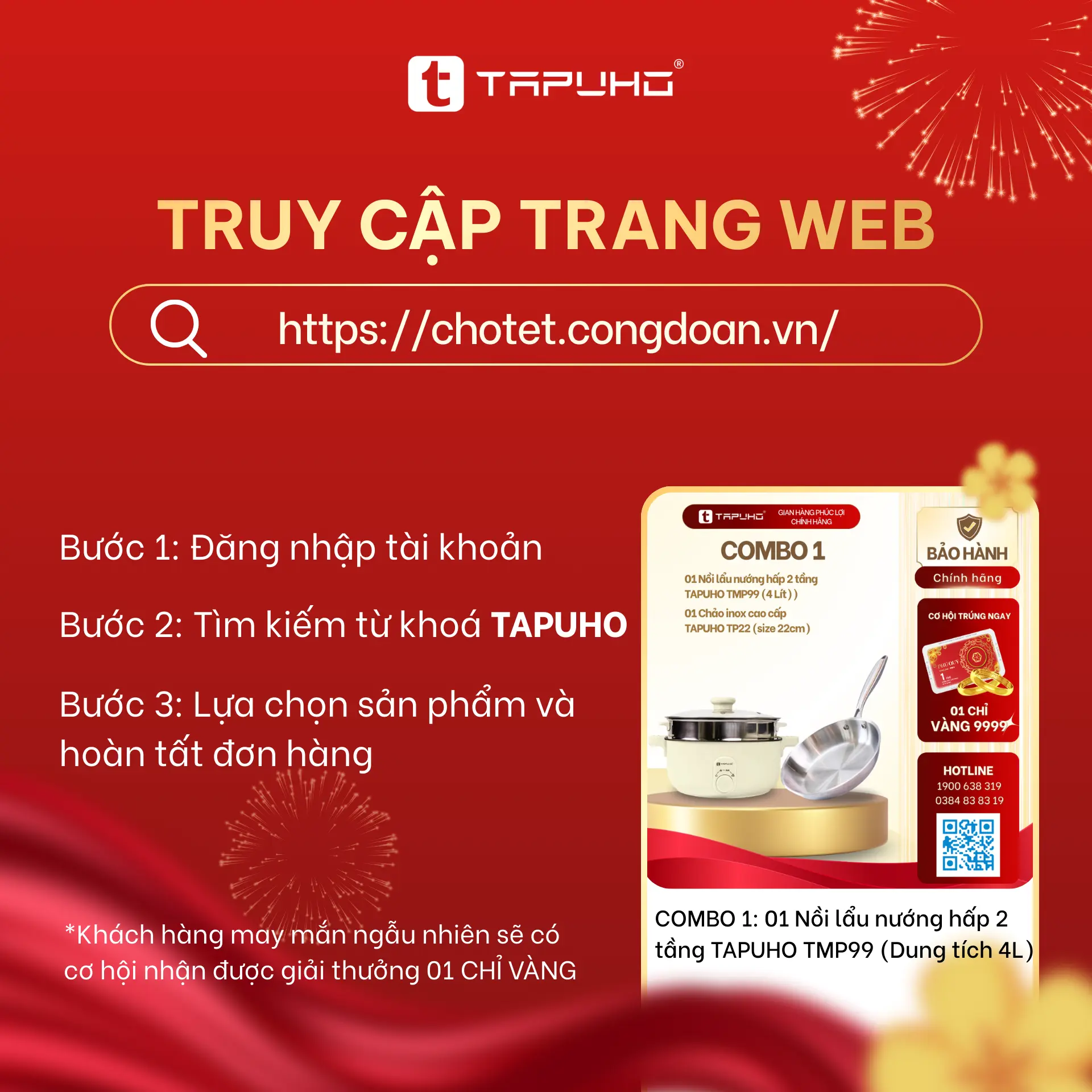 Trong thời gian diễn ra chương trình, khách hàng phát sinh đơn hàng các sản phẩm TAPUHO trên nền tảng Chợ Tết Công Đoàn sẽ có cơ hội nhận được 01 chỉ vàng do TAPUHO trao tặng.