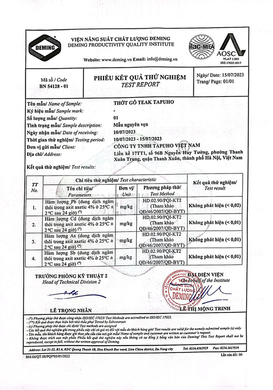 Kết quả thử nghiệm sản phẩm Thớt Gỗ TEAK TAPUHO do Viện Năng Suất Chất Lượng Deming chứng nhận