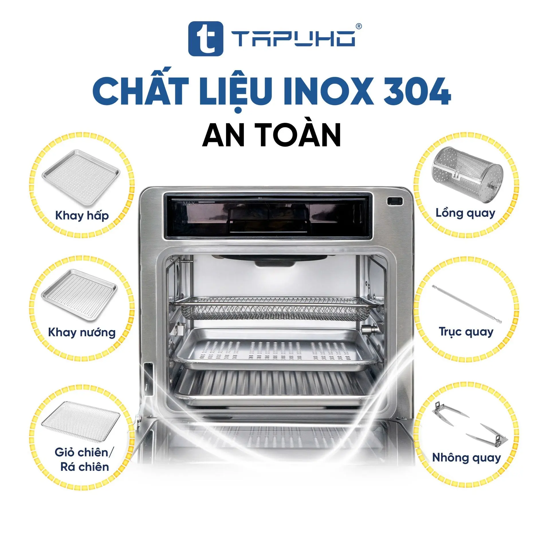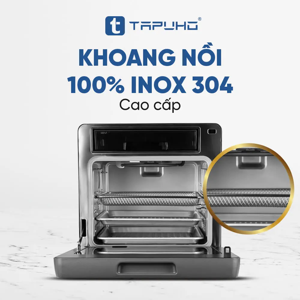 Toàn bộ phần khoang lò tiếp xúc trực tiếp với thực phẩm của TAPUHO LUXURY STEAM FRYER TSF16 SmartX đều được làm từ chất liệu inox304 cao cấp, an toàn, sáng đẹp theo thời gian và lại dễ dàng vệ sinh; không lo độc hại, bong tróc, han gỉ.