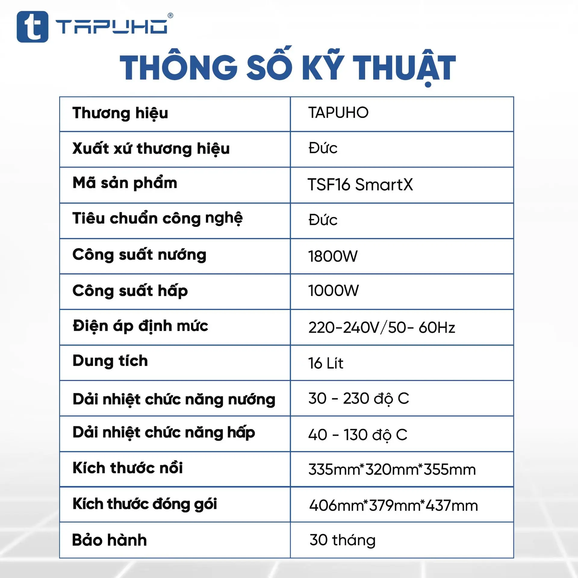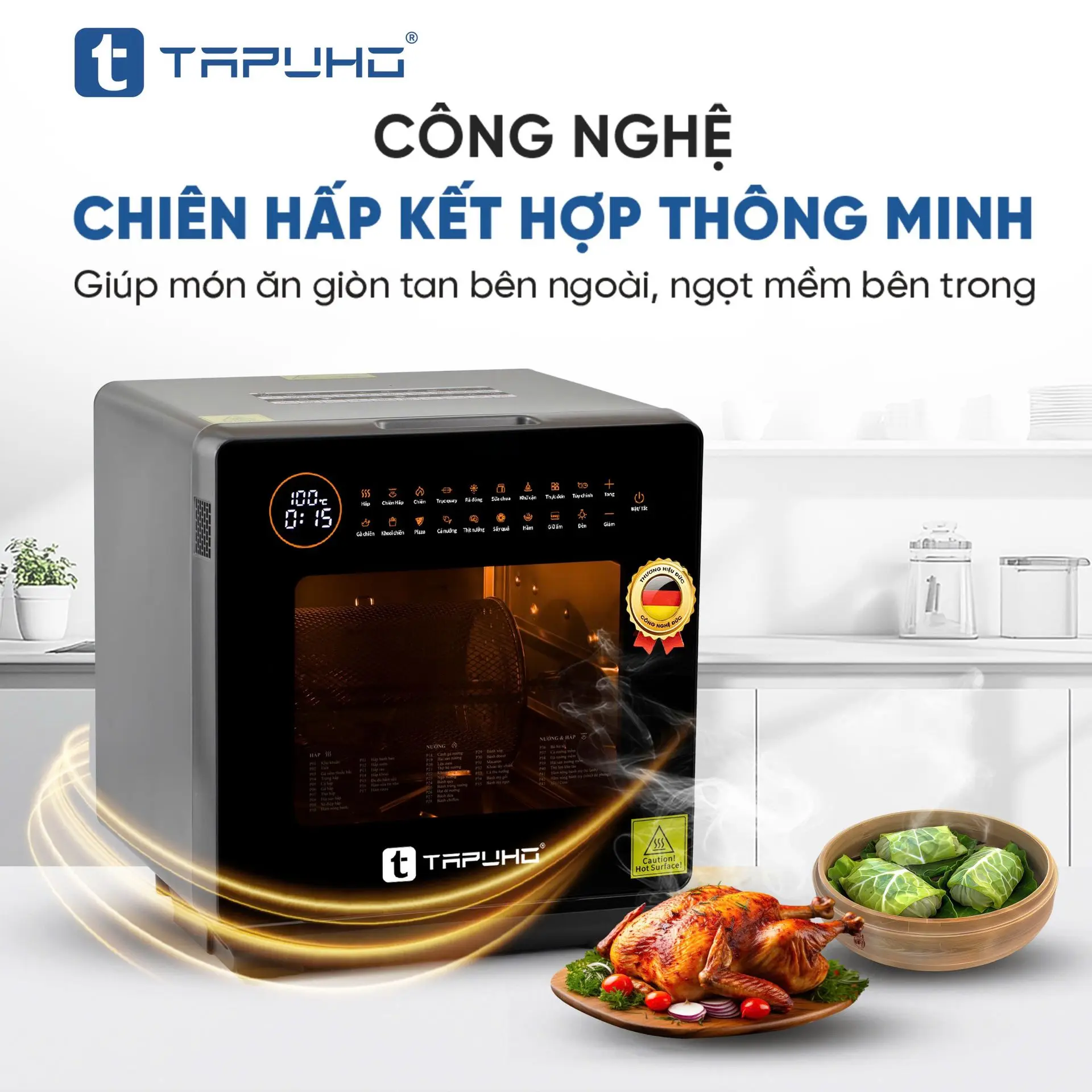 TAPUHO LUXURY STEAM FRYER TSF16 SmartX là sản phẩm nồi chiên hơi nước mới nhất của TAPUHO - thương hiệu gia dụng cao cấp đến từ Đức. Đây là dòng sản phẩm mang tính đột phá, bùng nổ công nghệ với sự kết hợp giữa nồi chiên không dầu (công nghệ rapid air) và nồi hấp (công nghệ hơi nước siêu nhiệt steam pro) mang đến sự tiện lợi cho khách hàng, ngoài ra nó còn là sự kết hợp 4 tính năng trong 1, đó là tính năng Hấp - Chiên không dầu - Chiên hấp kết hợp - Hầm và đặc biệt có những chức năng chỉ có trên TAPUHO LUXURY STEAM FRYER TSF16 SmartX mà chưa từng có trên bất kỳ sản phẩm cùng loại nào trên thị trường.