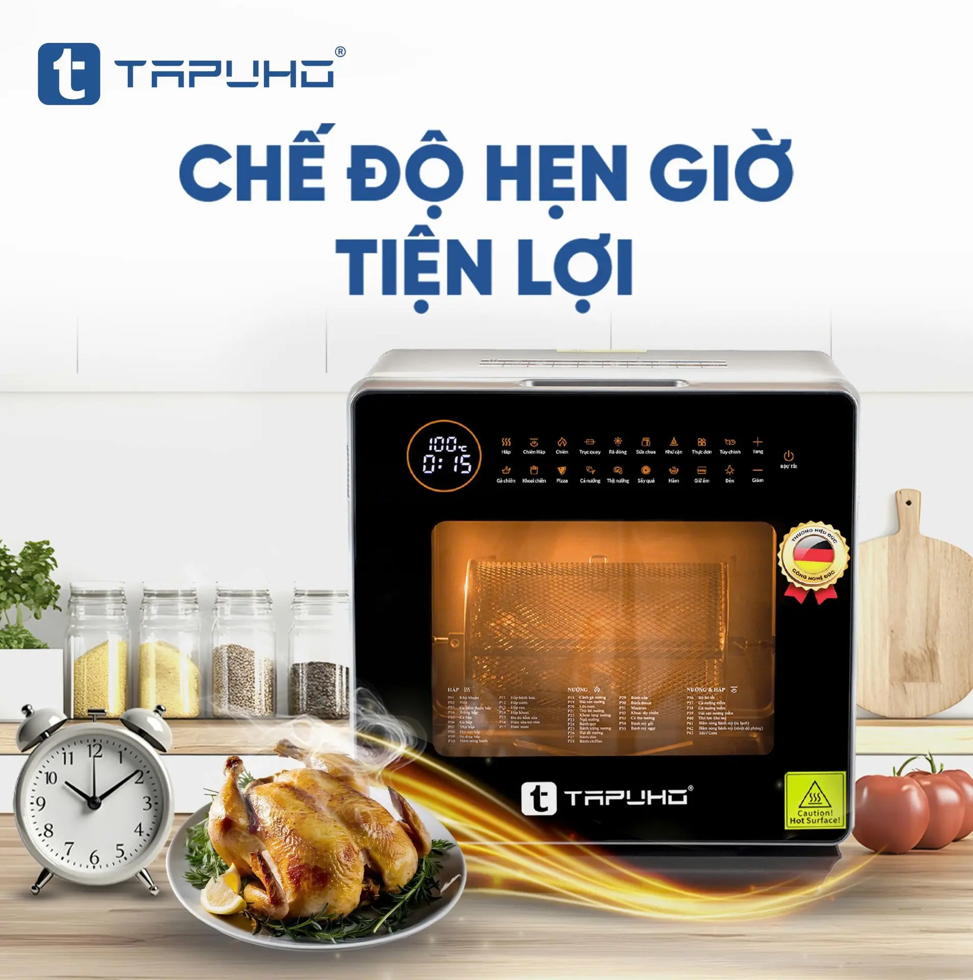- Nồi chiên hơi nước TAPUHO LUXURY STEAM FRYER TSF16 SmartX có 1 công tắc an toàn, đảm bảo khi đóng cửa nồi, nồi mới hoạt động và khi cửa chưa được đóng chặt thì nồi sẽ không hoạt động.