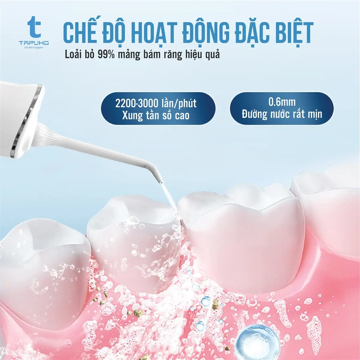 - Phòng ngừa được các bệnh về răng miệng: Nhờ đầu tăm trên máy giúp vệ sinh nướu sạch sẽ, bảo vệ khoang miệng tránh khỏi vi khuẩn gây hôi miệng, sâu răng và giúp phục hồi tổn thương răng miệng hiệu quả.