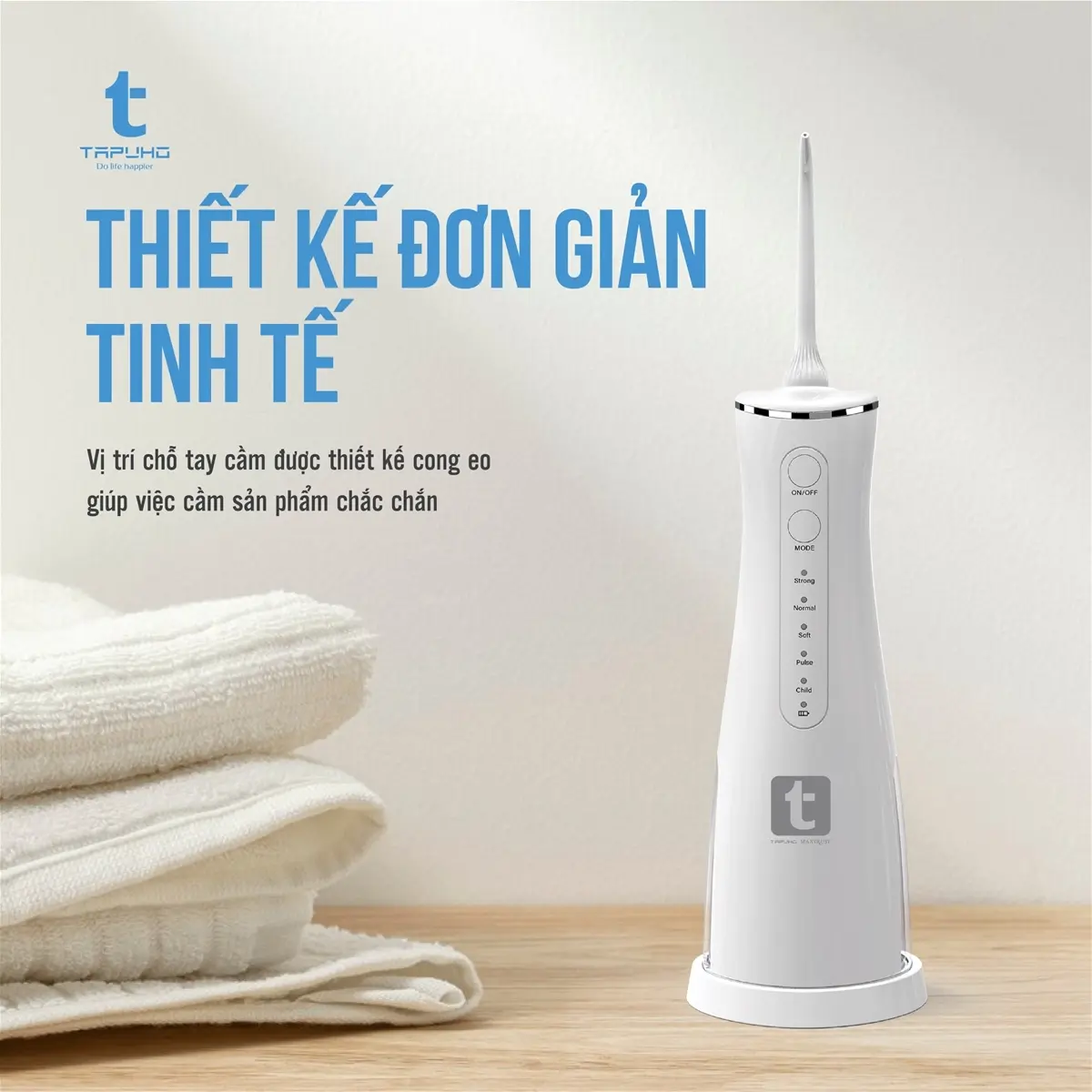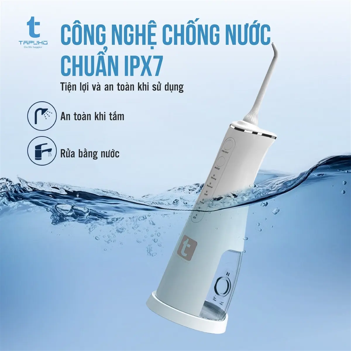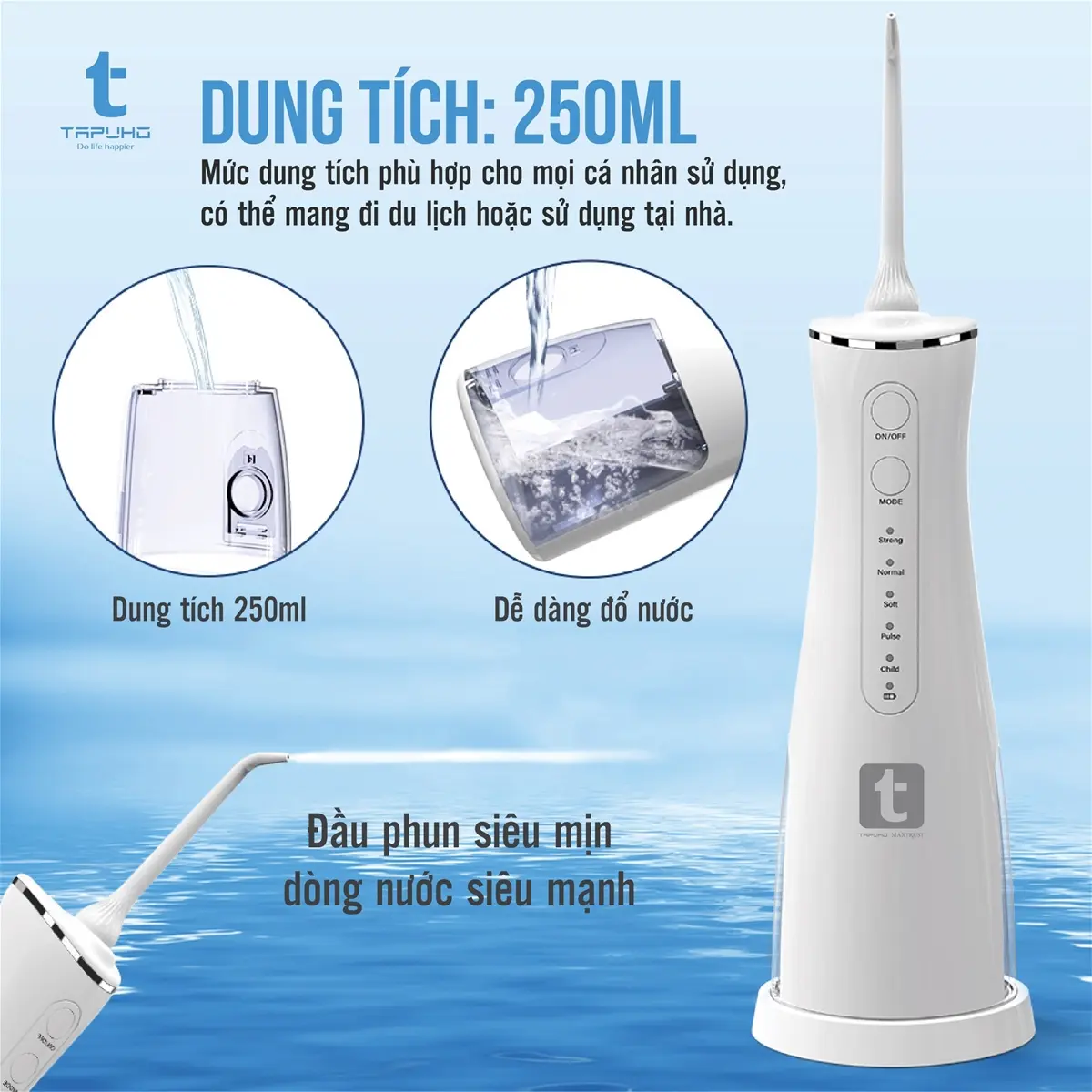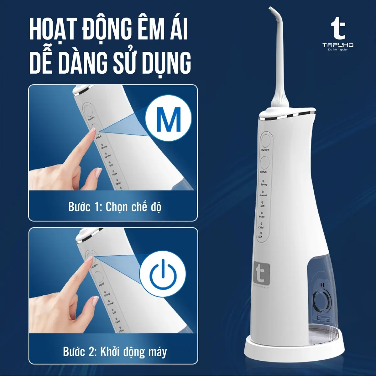 Tăm nước TAPUHO TWT2024 gồm 5 chế độ tương đương với 5 áp lực nước khác nhau, phù hợp nhiều độ tuổi từ trẻ em đến người lớn và các đối tượng có nhu cầu sử dụng khác nhau: