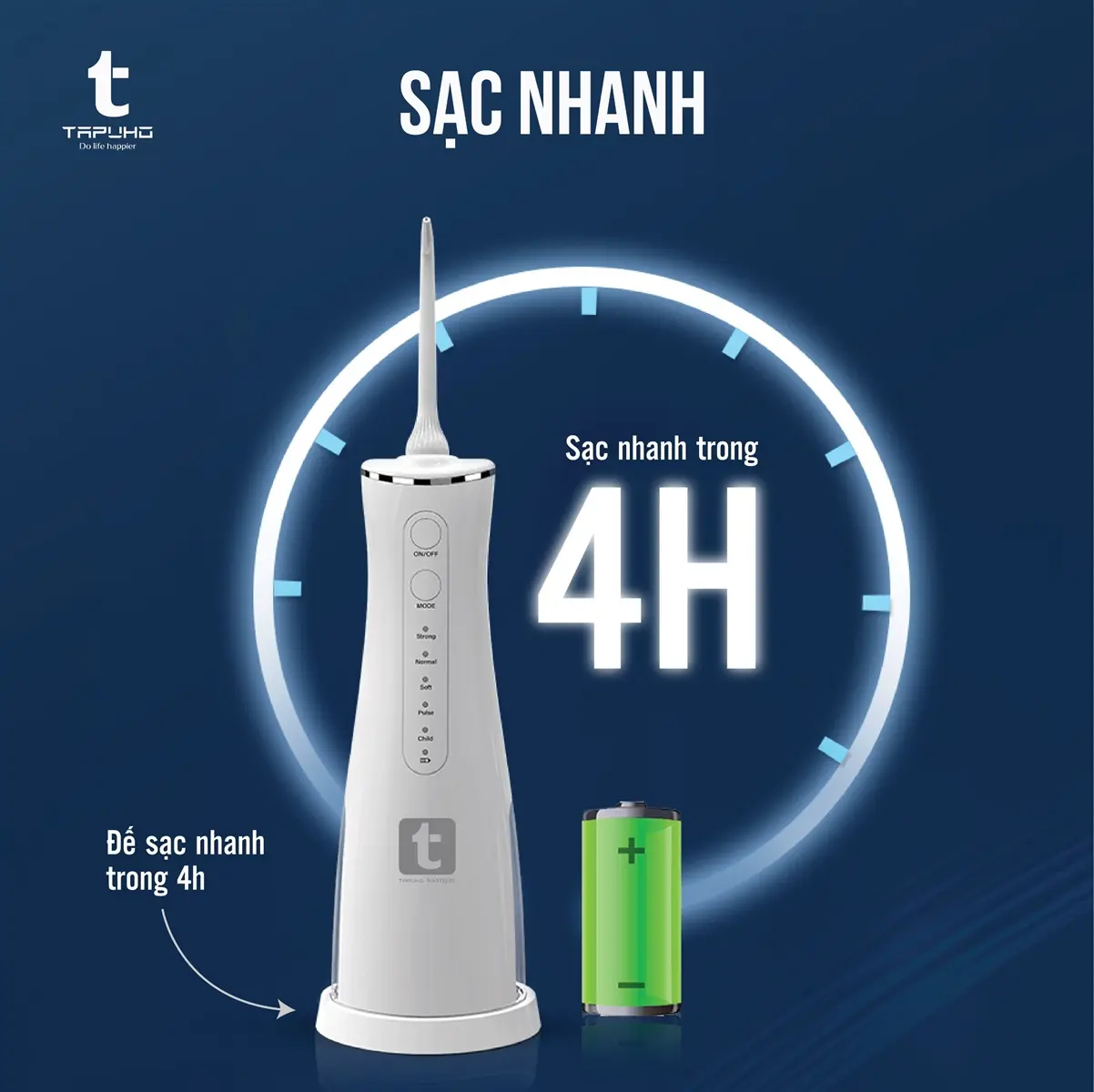 Tăm nước thông minh TAPUHO TWT2024 có 1 đế sạc nhanh, sạc nhanh trong 4h.