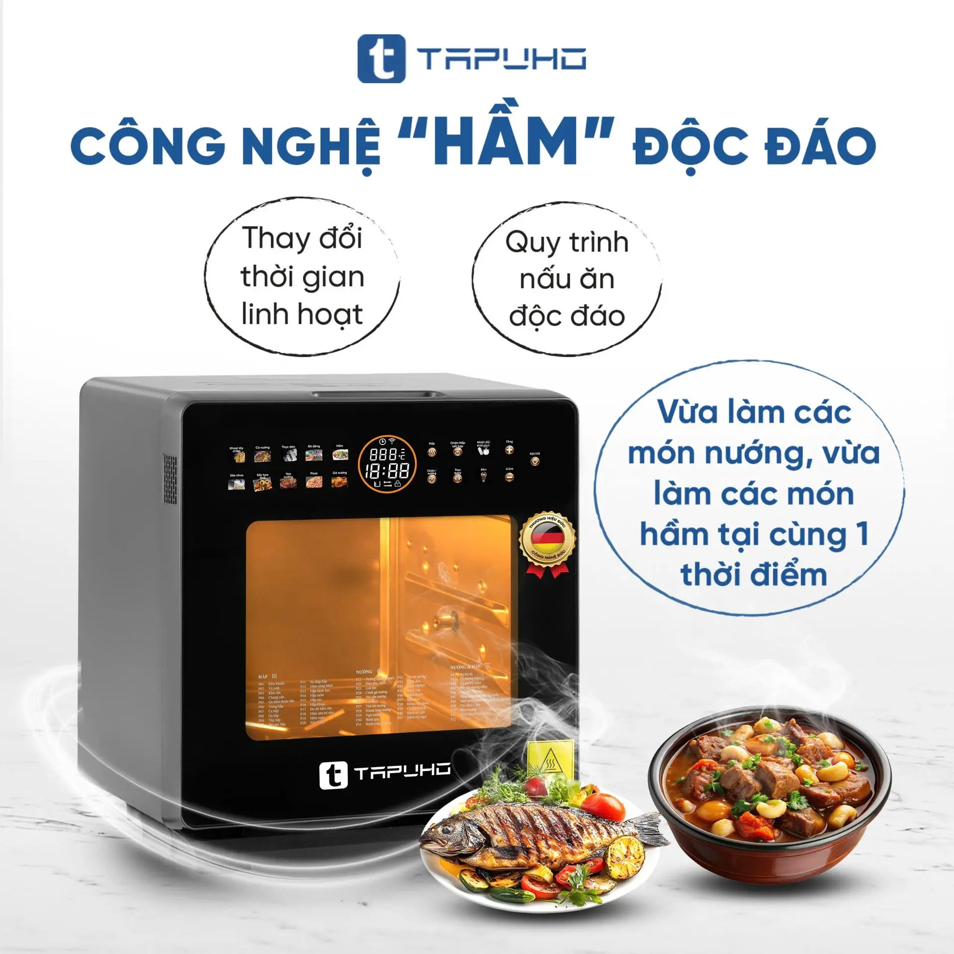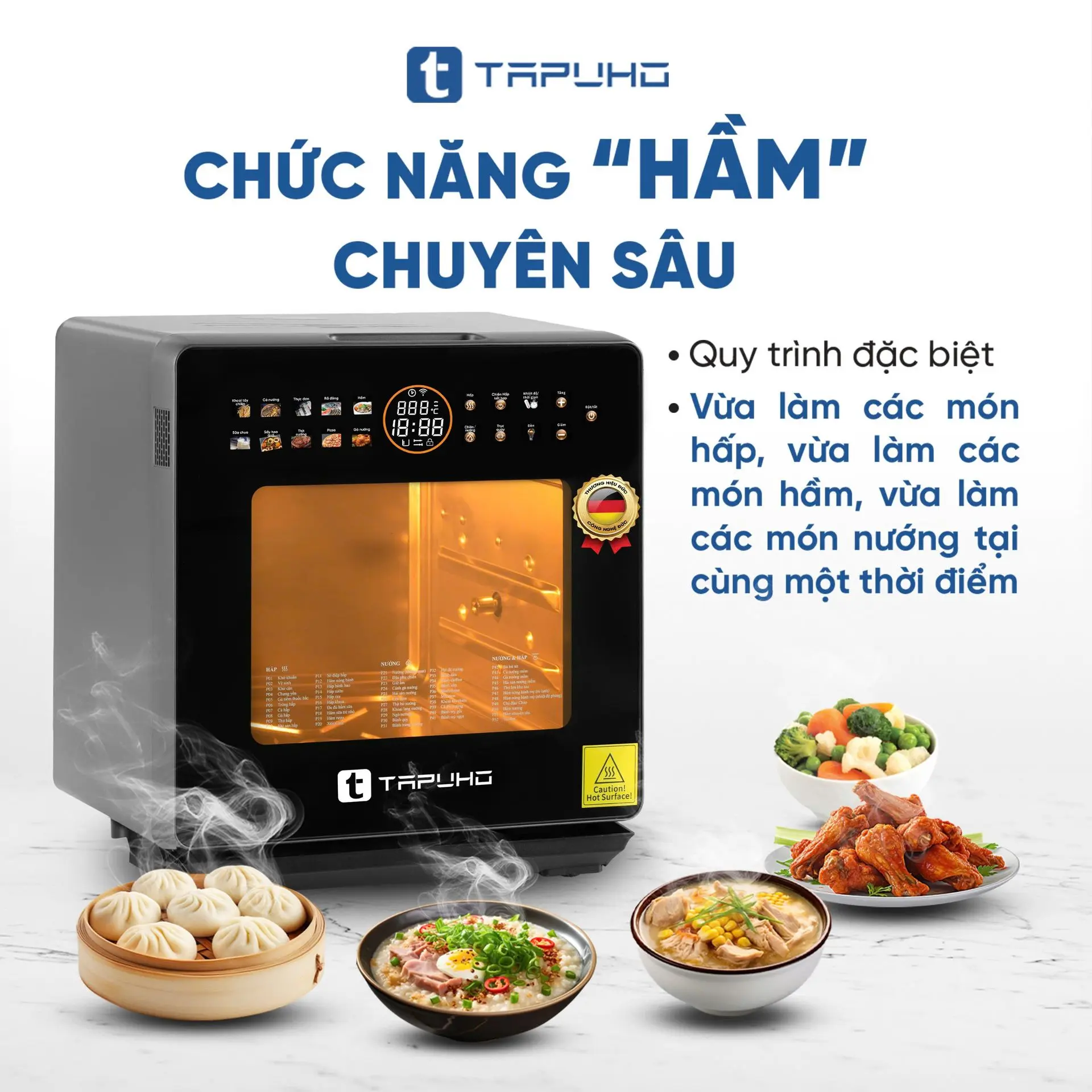 Thực tế, nhiều người khách hàng nhầm công nghệ HẤP với công nghệ HẦM vì công nghệ Hấp cũng có thể làm mềm đồ ăn với thời gian nấu kéo dài nhưng công nghệ Hấp chỉ có thể làm mềm các nguyên liệu có độ cứng thấp như gạo, thịt gà, thịt chim, thịt lợn… và chỉ có thể làm các món hấp được thôi. Còn với công nghệ HẦM – là công nghệ độc đáo kết hợp xen kẽ giữa công nghệ hấp, công nghệ nướng và công nghệ chiên hấp kết hợp. Người dùng có thể hầm các nguyên liệu cứng như hầm xương, hầm đậu, hầm đuôi bò…. và điều đặc biệt nhất, với công nghệ HẦM, người dùng vừa có thể làm các món chiên nướng, vừa có thể làm các món hầm TẠI CÙNG MỘT THỜI ĐIỂM; thậm chí với chức năng HẦM CHUYÊN SÂU ở TAPUHO TSF16 COLOR PLUS thì vừa có thể làm các món chiên nướng, vừa có thể làm các món hấp, vừa có thể làm các món hầm TẠI CÙNG MỘT THỜI ĐIỂM. Đây là điểm đặc biệt, duy nhất chỉ có ở Nồi chiên hơi nước TAPUHO TSF16 COLOR PLUS mà không có ở bất kỳ dòng nồi chiên hơi nước nào trên thị trường.