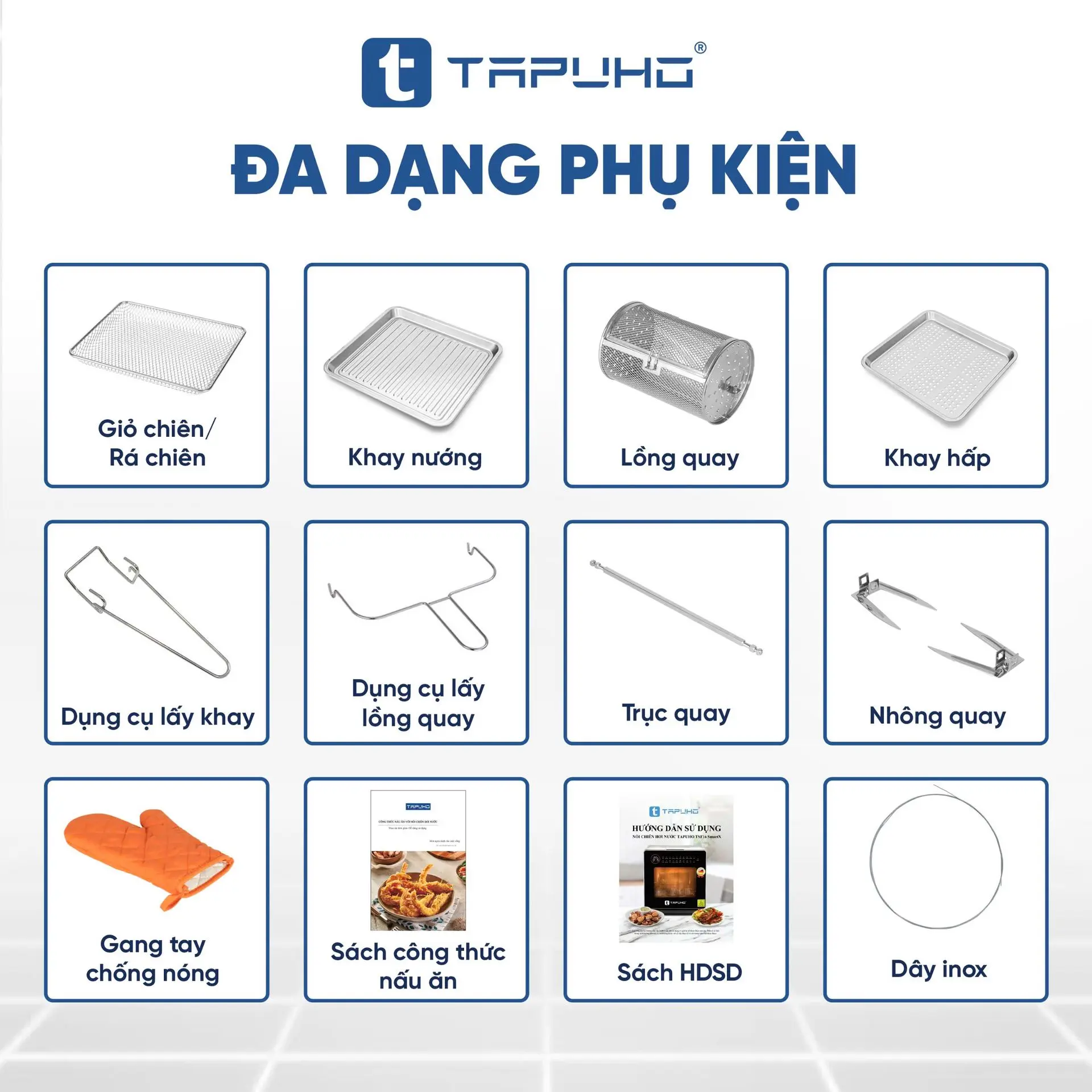 Khi chọn mua nồi chiên hơi nước TAPUHO LUXURY STEAM FRYER TSF16 SmartX, bạn sẽ được sở hữu trọn bộ sản phẩm nồi chiên hơi nước cùng với những phụ kiện hỗ trợ nấu ăn đa dạng nhất: