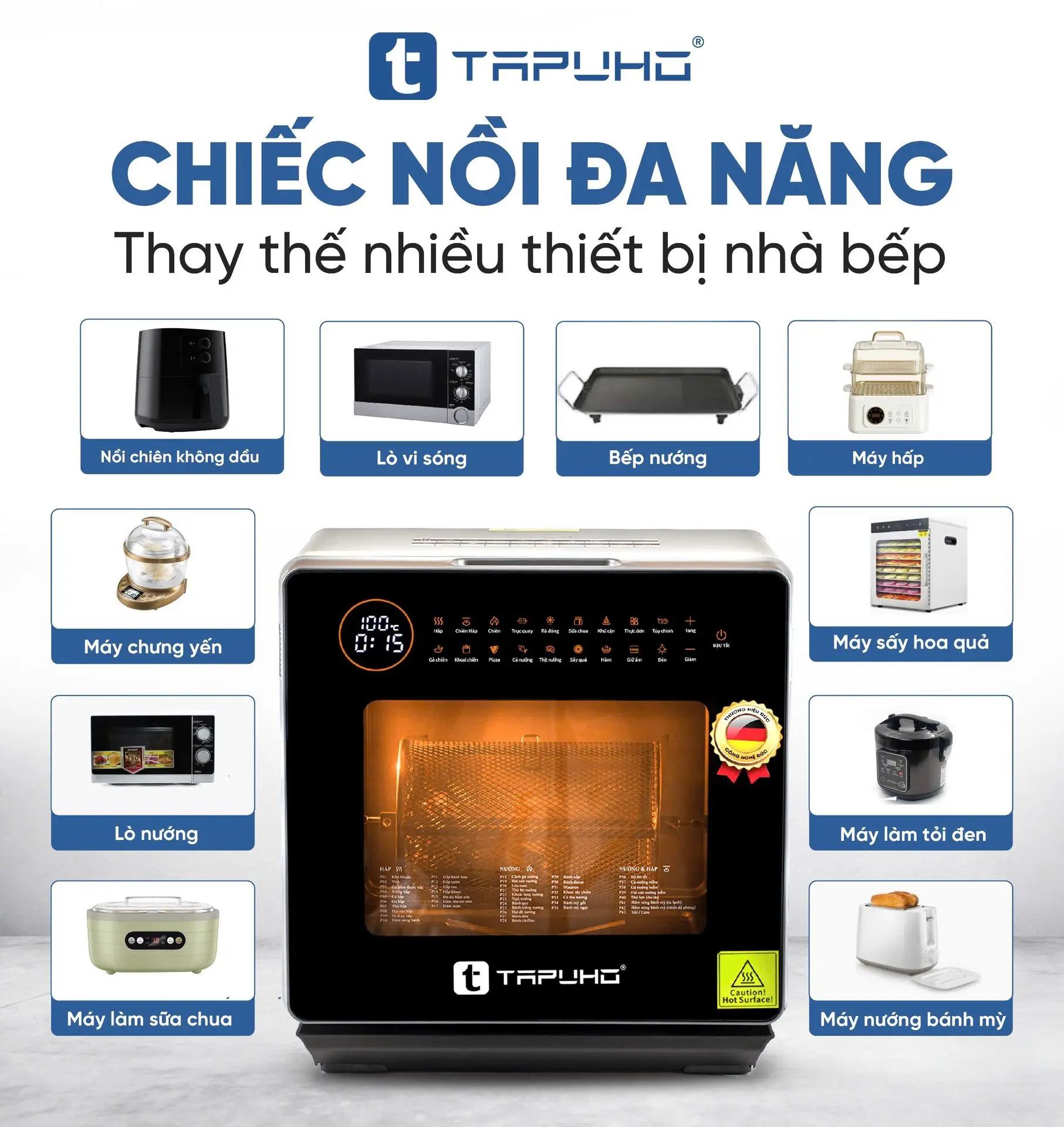 Nỗi lo không gian bếp chật hẹp không đủ không gian để chứa các thiết bị nhà bếp sẽ không còn nữa khi TAPUHO LUXURY STEAM FRYER TSF16 SmartX có thể sử dụng chức năng tương đương với 10 thiết bị nhà bếp khác nhau như : nồi chiên không dầu, nồi hấp, nồi áp suất, máy sấy hoa quả, máy ủ sữa chua, lò nướng, lò vi sóng, máy làm bỏng ngô, máy nướng bánh mỳ, ... và đặc biệt với tính năng đa dạng như vậy sẽ giúp chúng ta tiết kiệm được rất nhiều chi phí mua sắm, thời gian vệ sinh bảo dưỡng.